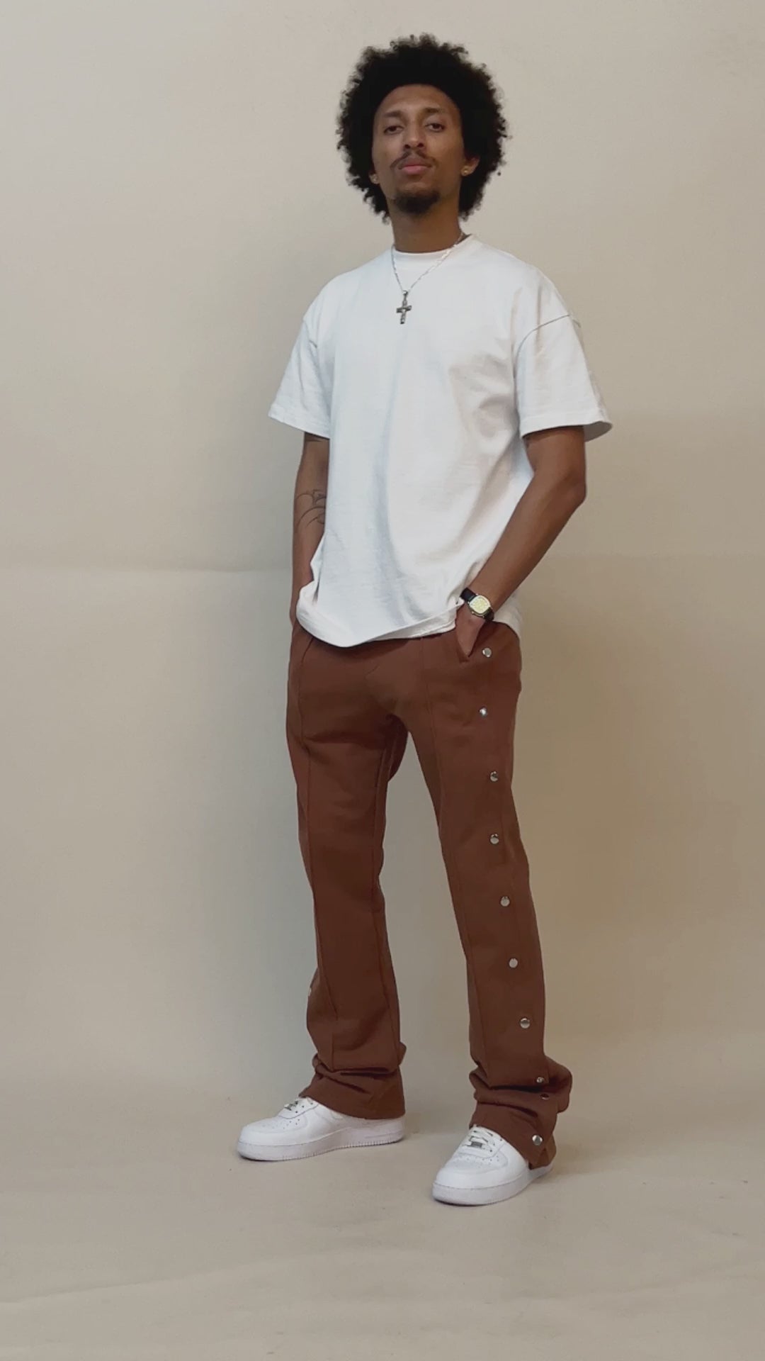 The French Terry Snap Flared Pants boast a stylish flared fit, adorned with snap buttons along the sides.