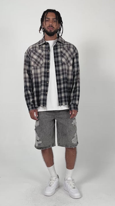 The perfect fall flannel is here in the Bleached Flannel. The relaxed fit, raw hem detailing, and natural fade and distressing throughout give it an authentic vintage look, perfect for layering over a Perfect Boxy Tee.