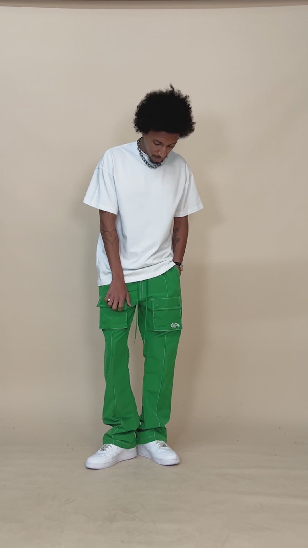 Introducing the Central Snap Pants, showcasing contrast stitching, cargo pockets, and sleek snap buttons adorning the sideseam. While all buttons add style, only the bottom three are functional, blending fashion with functionality seamlessly.