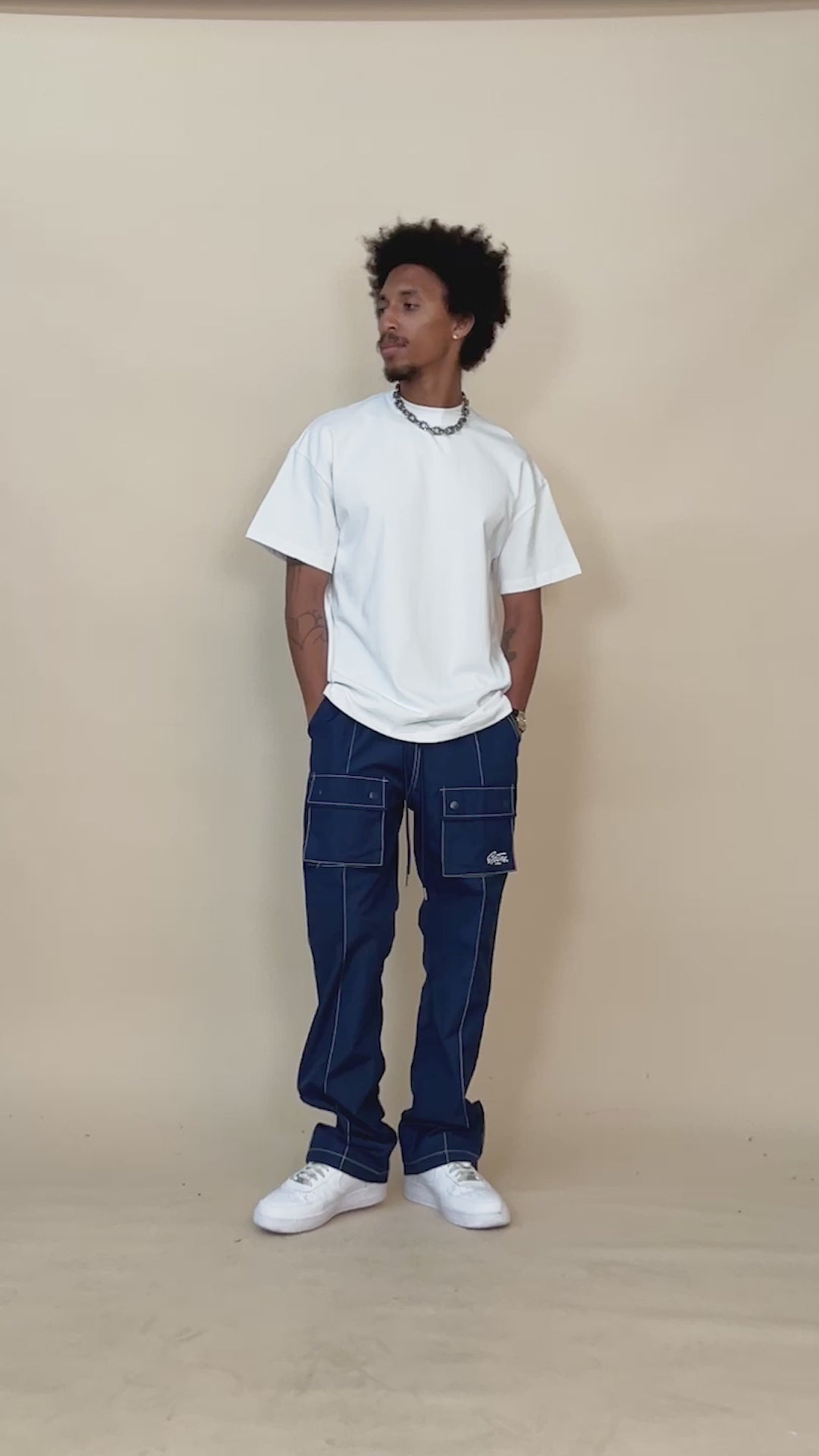 Introducing the Central Snap Pants, showcasing contrast stitching, cargo pockets, and sleek snap buttons adorning the sideseam. While all buttons add style, only the bottom three are functional, blending fashion with functionality seamlessly.