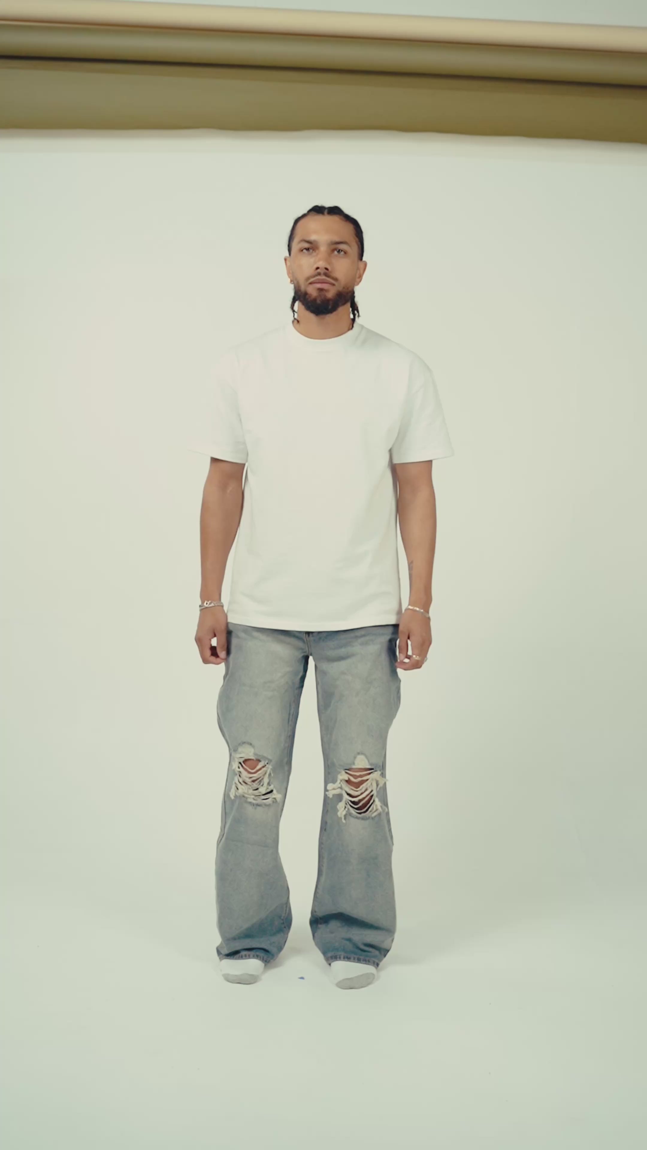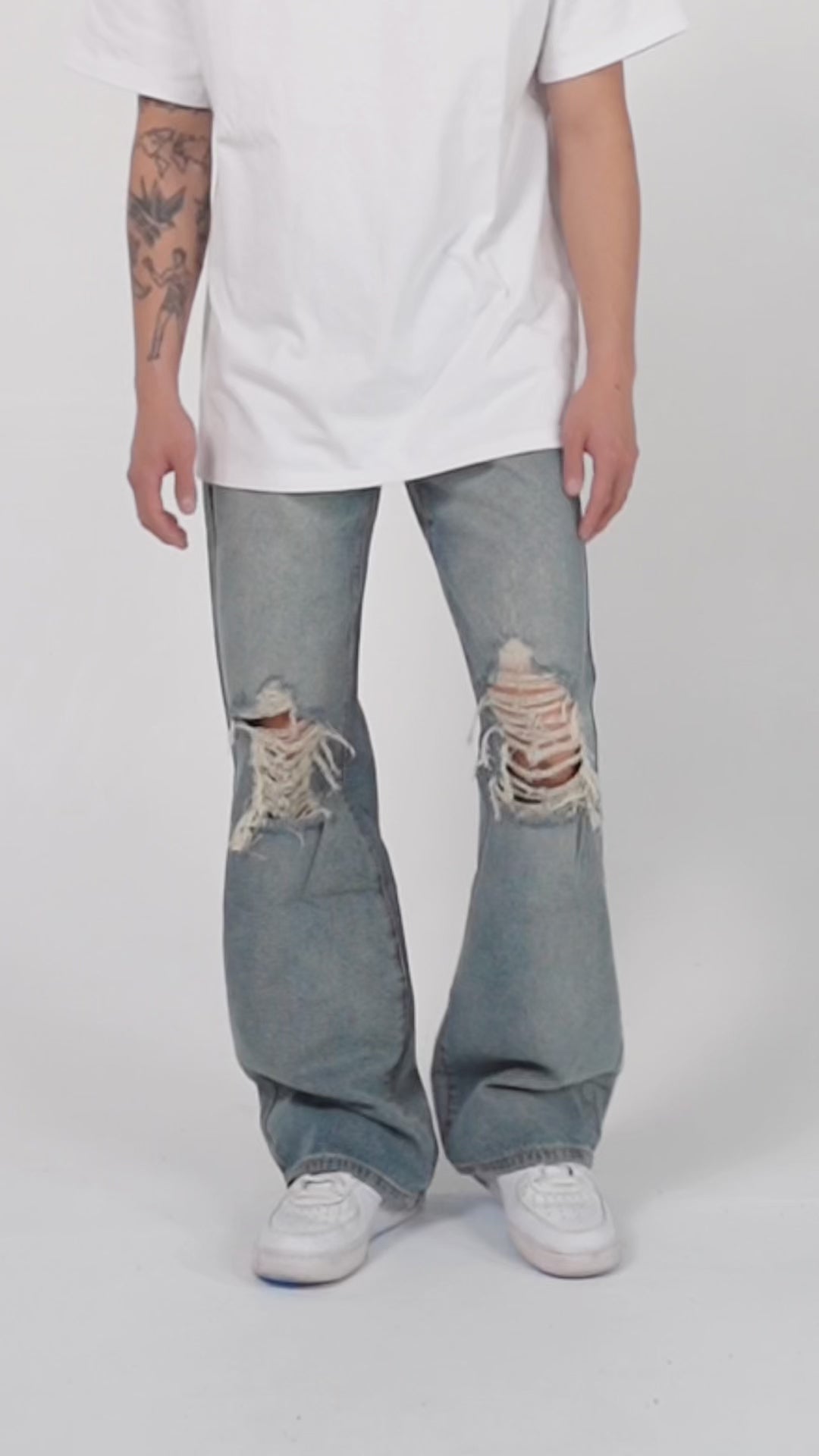The Distressed Basic Jeans are designed with a new loose fit, crafted from washed denim, featuring knee blowouts.