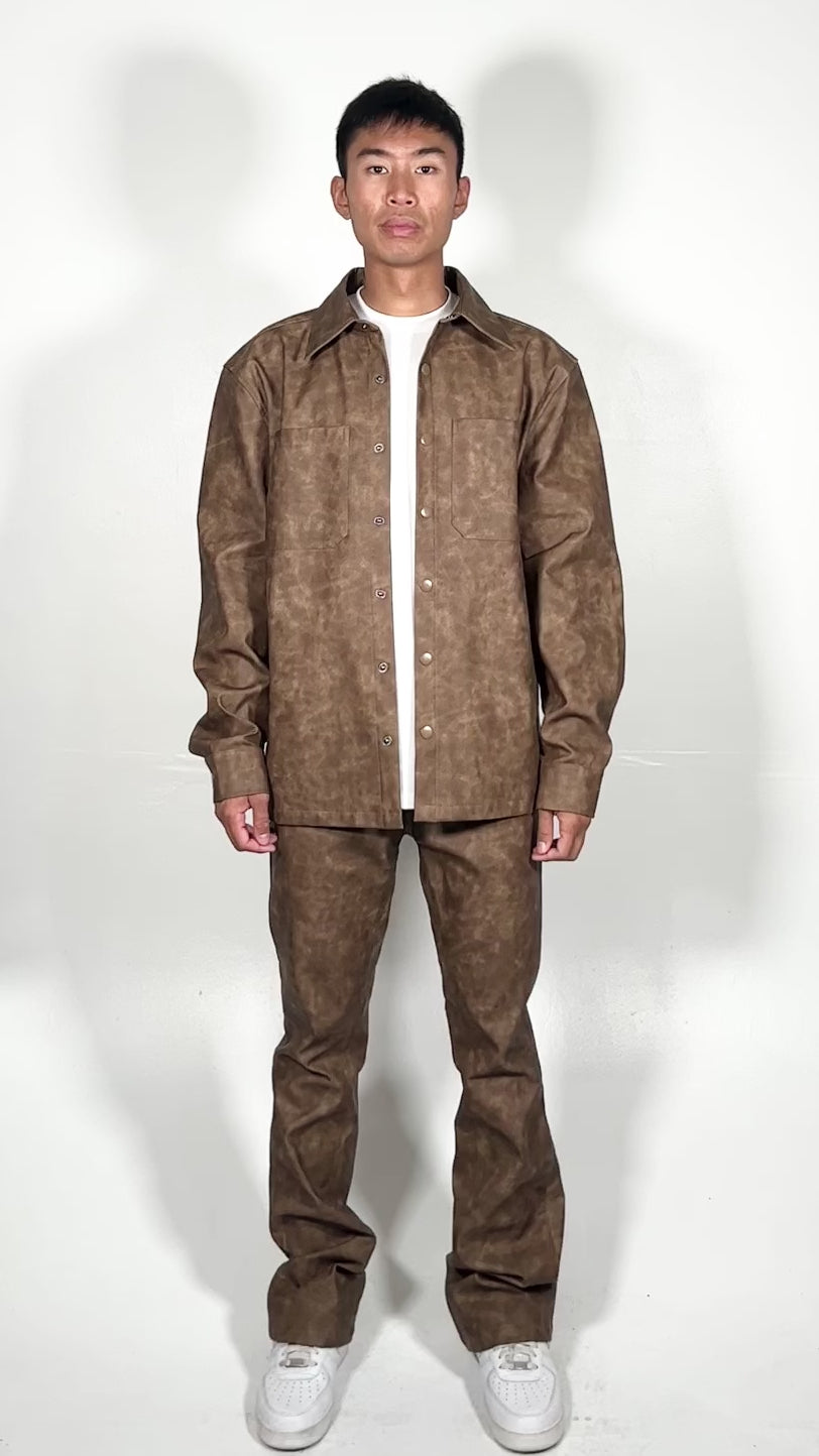 The Roadhouse Shirt takes a classic silhouette and creates a new spin. Made with vegan leather with a distressed look, this shirt is perfect for a fresh fall fit.