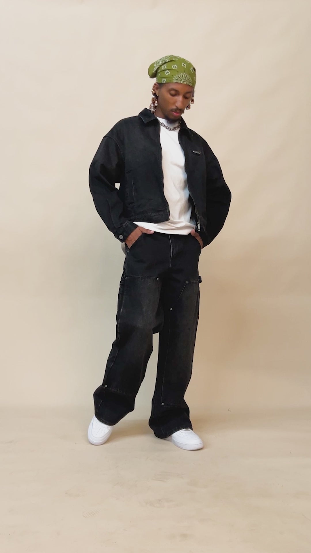 The Double Knee Pants have a relaxed, loose fit through the legs, made from 100% cotton with no stretch. They feature a longer inseam that falls around the shoes.