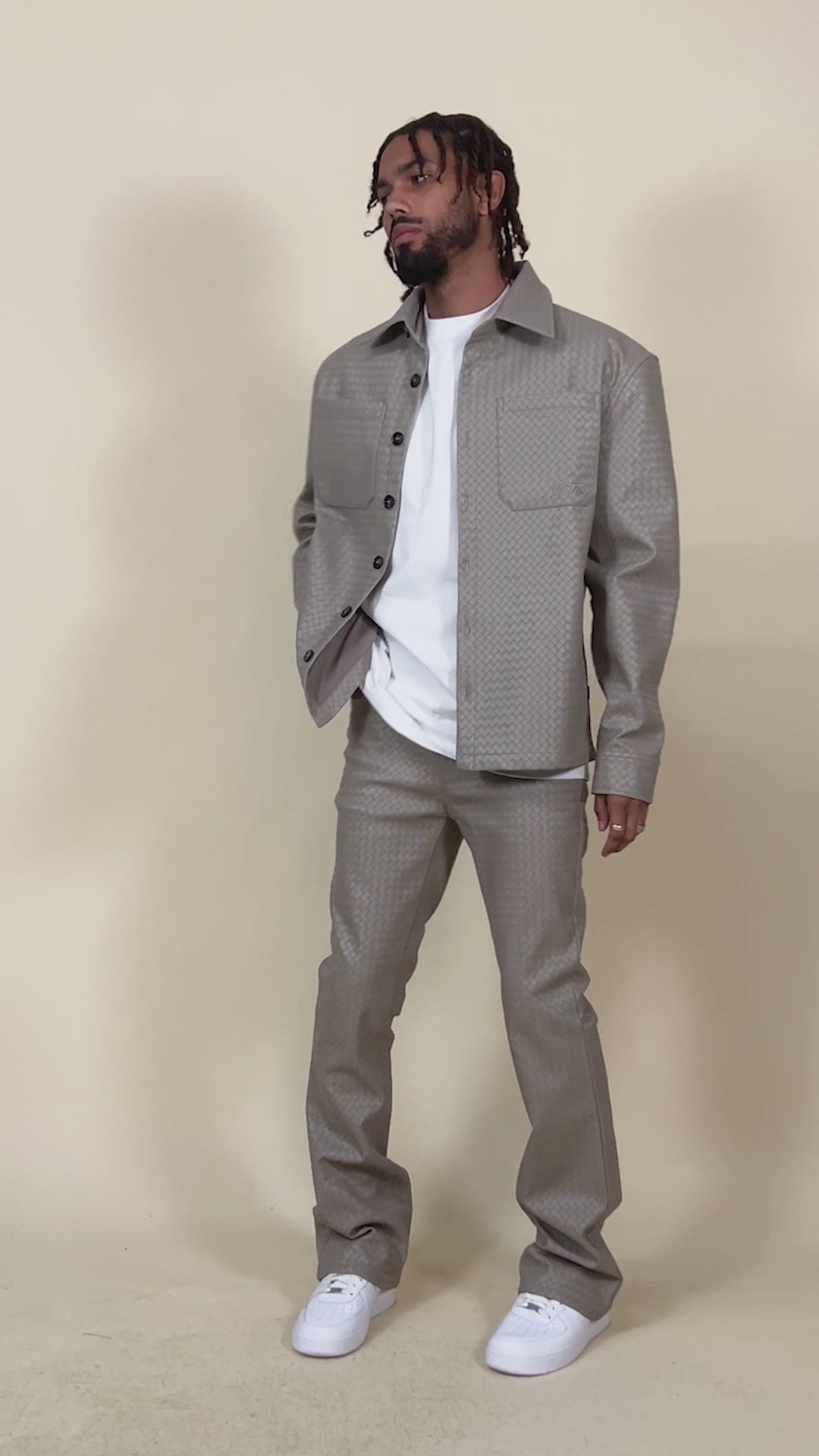 The Mateo Set offers a fresh take on a classic look. Made from webbing vegan leather, it pairs an oversized shirt with slim-flared pants for a chic, updated silhouette.