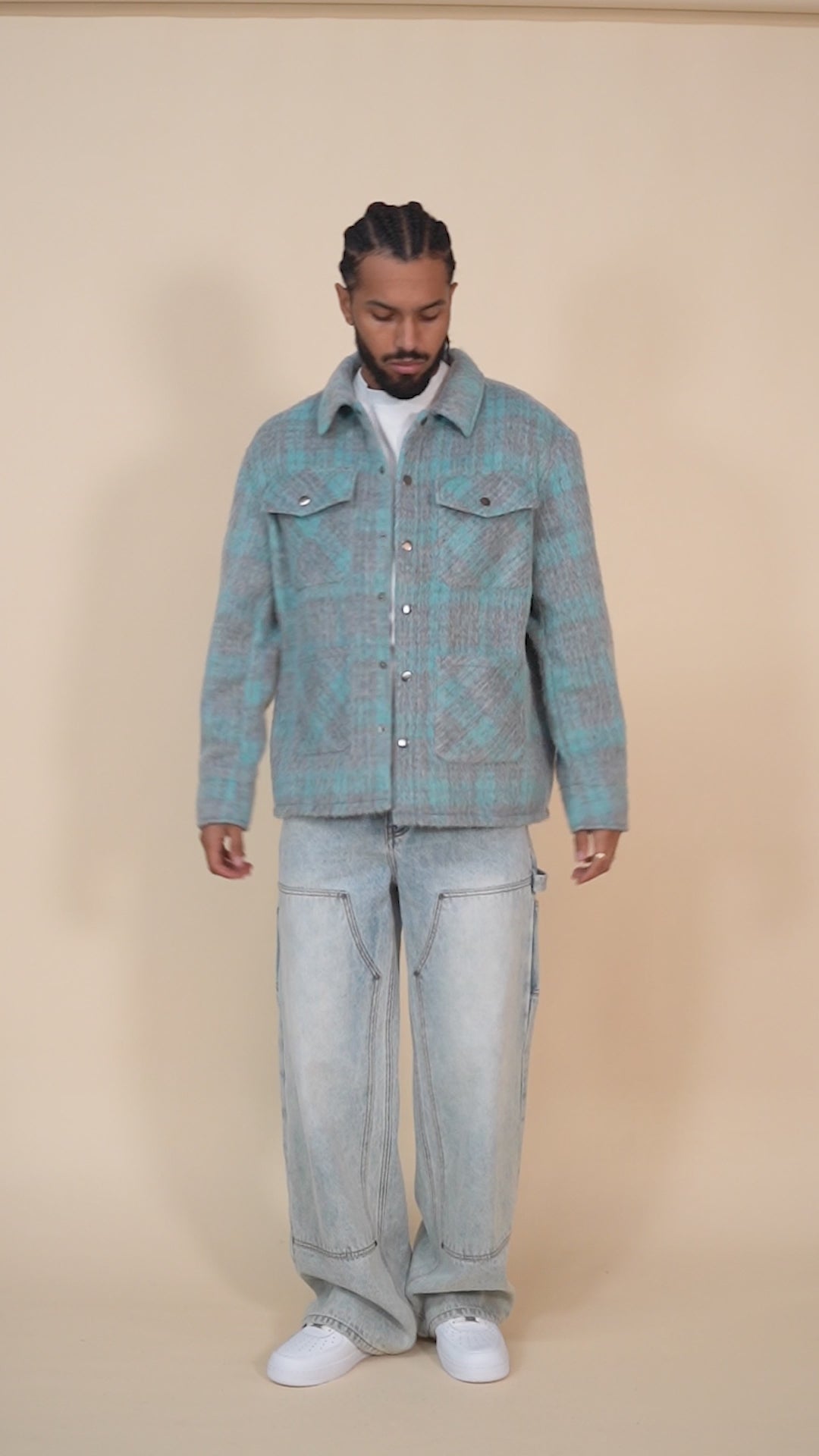 The Mohair Chore Coat is the classic work jacket with a new, mohair flannel spin. This jacket features front snap buttons and multiple pockets throughout.