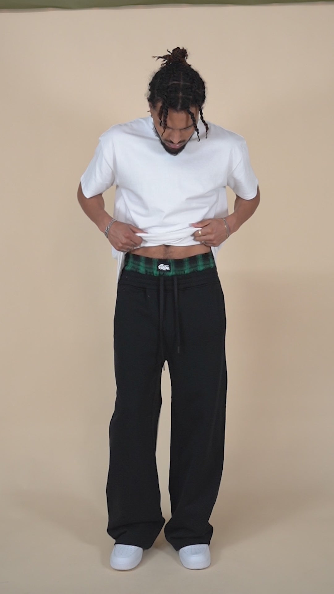 The PJ Pants are the perfect basic baggy pants for spring, featuring a double waistband with flannel patchwork to elevate your look. Made with french terry fabric.