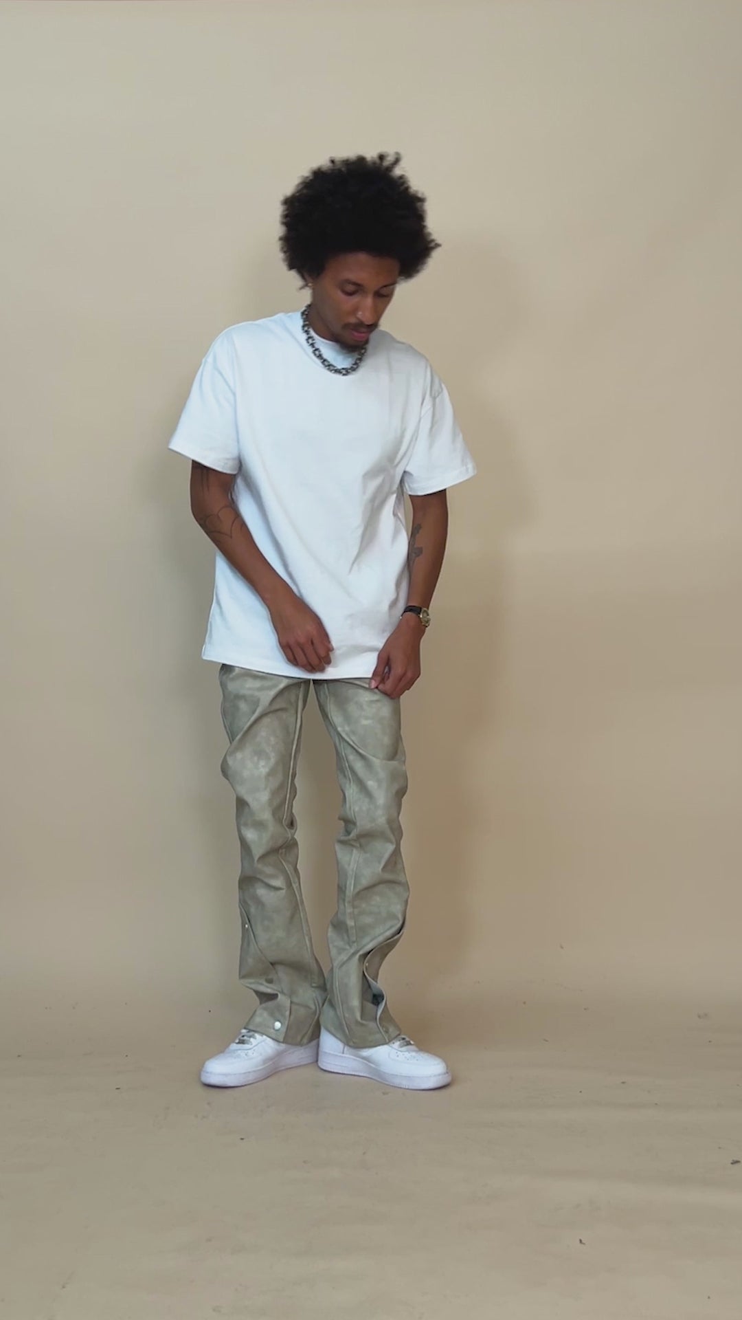 The Rodeo Flare Pants are made with aged vegan leather for the classic western look. The pants feature unique snap button pocketing at the leg.