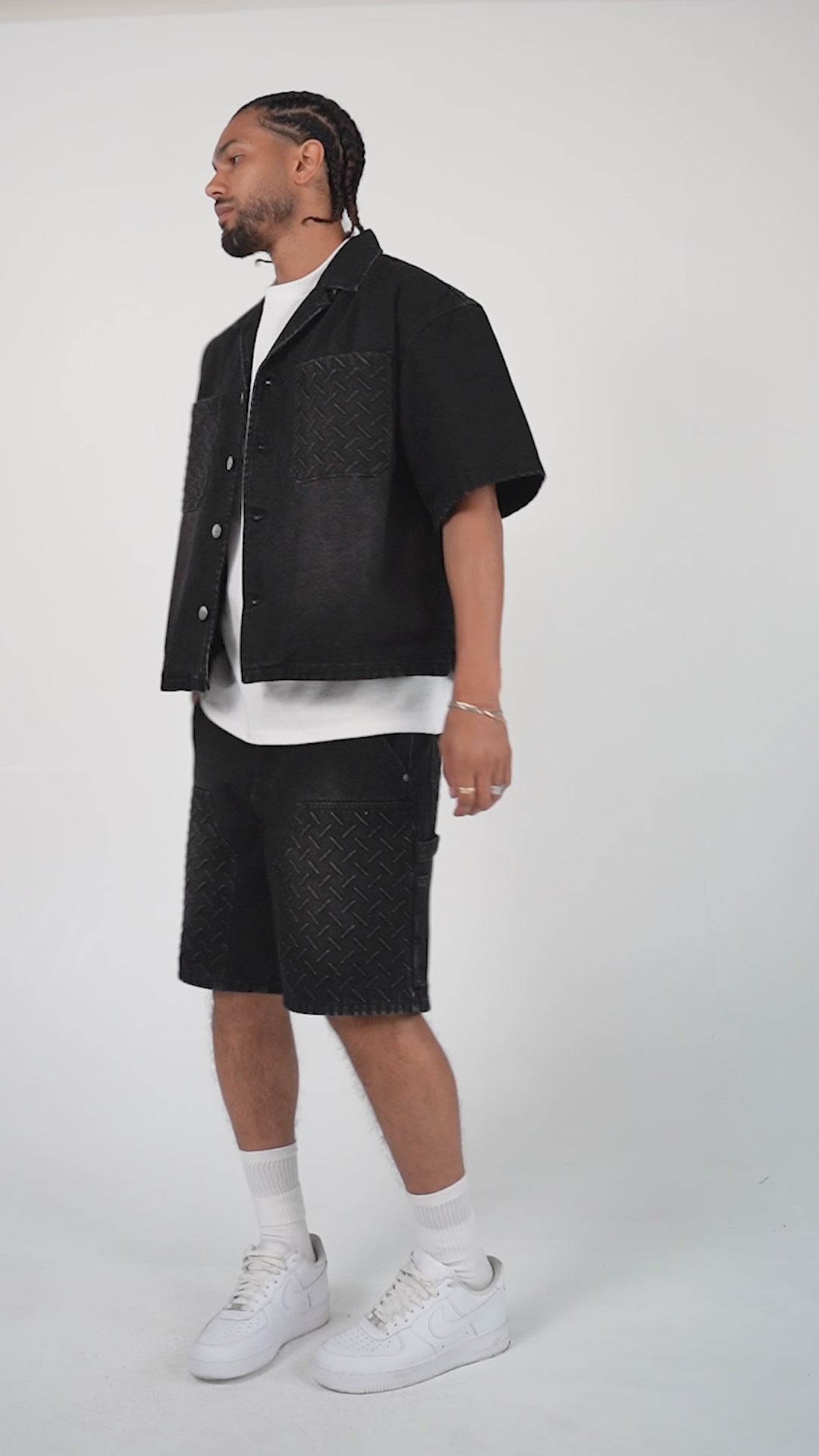 The Steeler Shirt is made with heavyweight non-stretch denim in an oversized, boxy fit. This shirt is embellished with an embossed steel on the front pockets and back yoke.