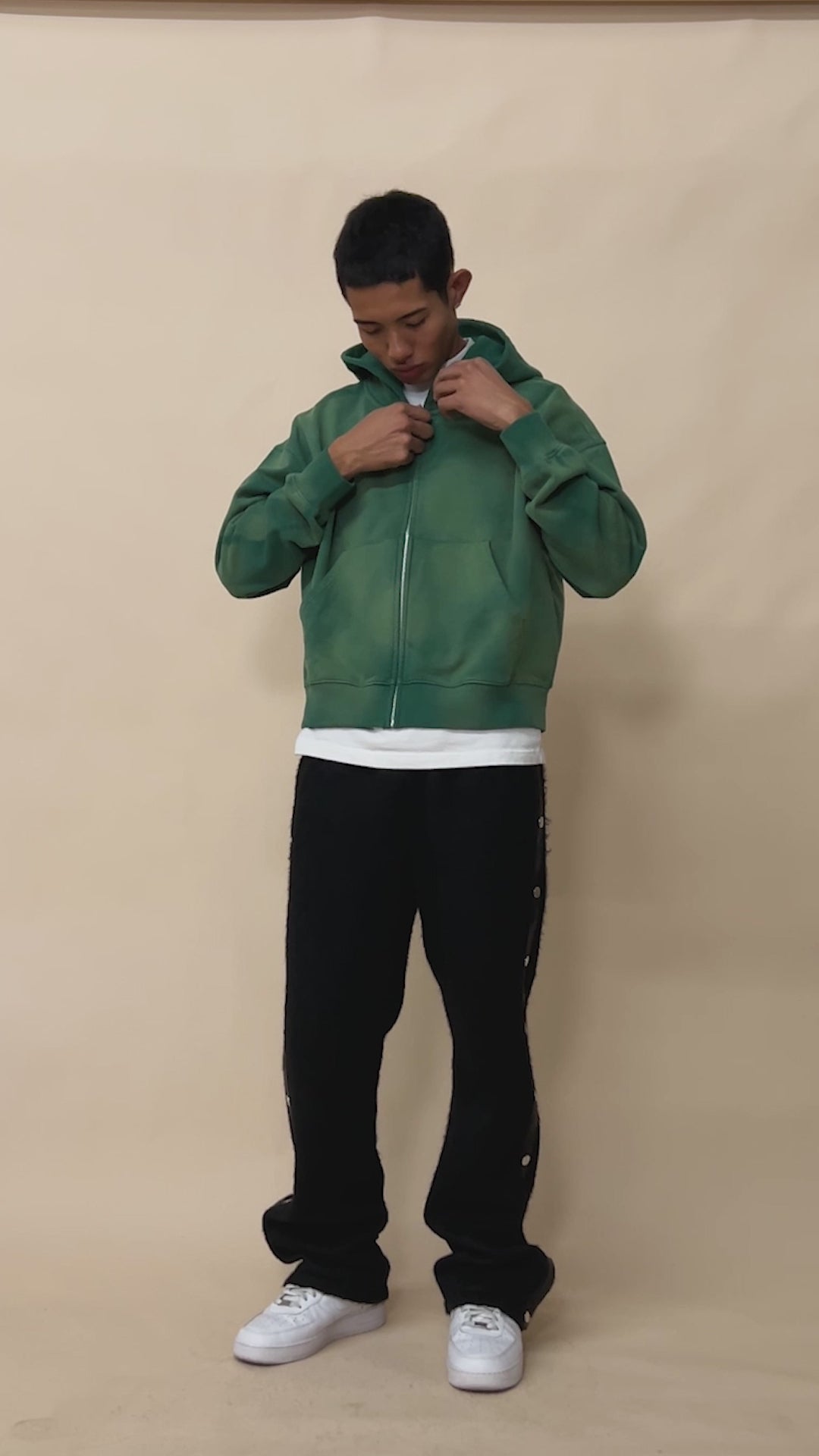 Elevate your wardrobe with our Sun-Faded Zip-Up Hoodie, where style meets exceptional comfort. Crafted from shrink-free French terry fabric, it features an oversized, cropped fit and uniquely irregular sun-faded patterns achieved through the dye process.