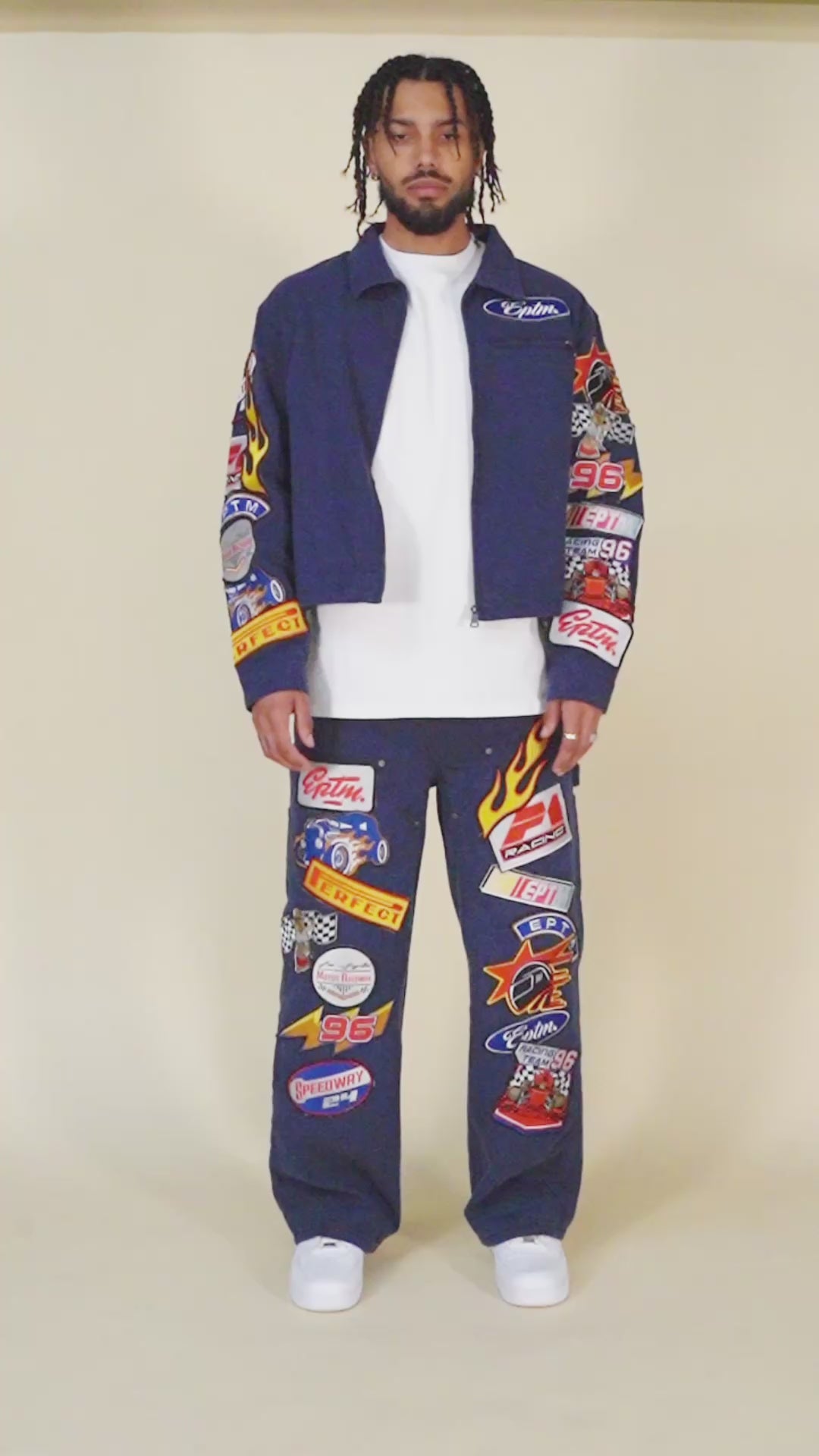 The Turbo Carpenter Pants are classic, relaxed-fit carpenter work pants, covered with custom racing-themed patches.